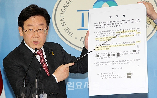 이재명 성남시장이 3일 오후 국회 정론관에서 '셋째형 정신병원 입원, 철거민과의 폭행시비' 등을 보도한 TV조선 관련 기자회견 도중 관련자료를 설명하고 있다.