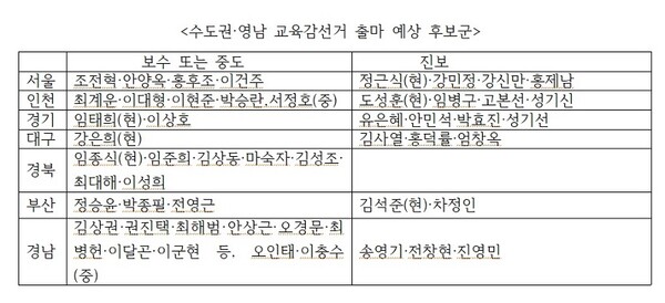 [일요서울 | 강혜수 기자] 내년 6월 3일 치러지는 제9회 전국동시지방선거를 앞두고 각 지역 교육감 선거도 주요 관심 사안 중 하나다. 지방선거가 8개월여 앞으로 다가오면서 각 지역 후보군에 대한 하마평이 무성한 상황이다. 교육감 선거는 정당 공천이 이뤄지는 선거는 아니지만 보수와 진보진영별로 여러 후보군의 이름이 오르내리고 있다. 일요서울은 수도권과 영남지역 후보군으로 어떤 인물들이 거론되고 있는지 살펴봤다.