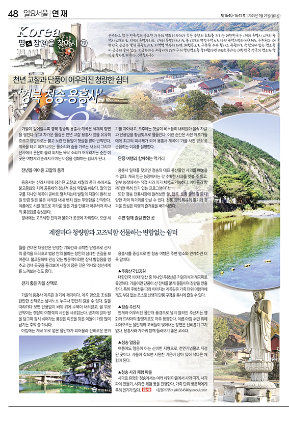 [일요서울 | 김정아 기자] 가을이 깊어질수록 경북 청송의 용흥사 계곡은 색채의 향연을 펼친다. 맑고 차가운 물길은 천년 고찰 용흥사 앞을 유유히 흐르고 양옆으로는 붉고 노란 단풍잎이 햇살을 받아 반짝인다. 계곡을 타고 퍼져 나오는 물소리와 숲을 가르는 새소리 그리고 산사에서 은은히 울려 퍼지는 목탁 소리가 어우러지는 순간 이곳은 여행자의 순례지가 아닌 마음을 정화하는 쉼터가 된다.