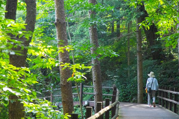 하늘을 찌를 듯 솟은 나무들 사이로 데크 길이 이어져있고 그 옆으로 깨끗한 계곡물이 흐른다.