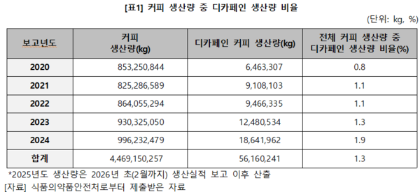 박 의원실이 식품의약품안전처로부터 제출받은 자료를 분석한 결과, 지난해 디카페인 커피 생산량은 1864만1962kg으로 2020년 646만3307kg에 비해 약 2.9배 증가했다.