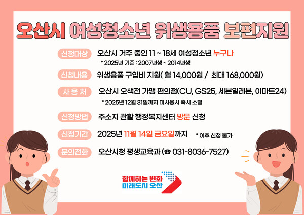 [일요서울|오산 강의석 기자] 오산시는 여성청소년의 건강권 보장과 보편적 복지 실현을 위해 올해 처음 시행한 ‘여성청소년 위생용품 보편지원사업’의 신청을 오는 11월 14일 마감한다. 아직 신청하지 않은 대상자는 혜택을 받을 수 있도록 서둘러 참여해야 한다.