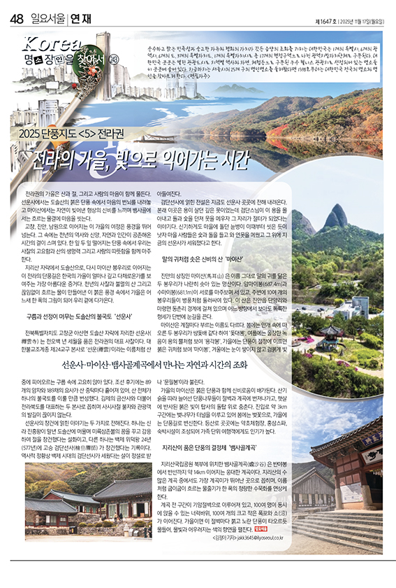 지리산 자락에서 도솔산으로, 다시 마이산 봉우리로 이어지는 이 전라의 단풍길은 한국의 가을이 얼마나 깊고 다채로운가를 보여주는 가장 아름다운 증거다. 천년의 사찰과 불멸의 산 그리고 끊임없이 흐르는 물이 만들어낸 이 붉은 풍경 속에서 가을은 어느새 한 폭의 그림이 되어 우리 곁에 다가온다.