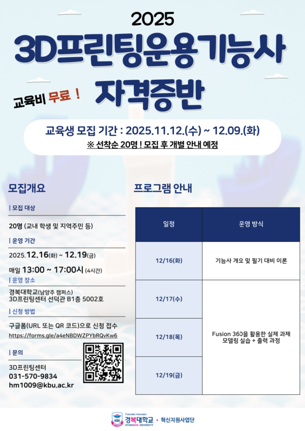 교육생 모집은 2025년 11월 12일(수)부터 12월 9일(화)까지이며, 총 20명을 대상으로 운영된다. 교육은 2025년 12월 16일부터 19일까지 남양주캠퍼스 선덕관 B1 5002호 3D프린팅실에서 4일간 진행된다.